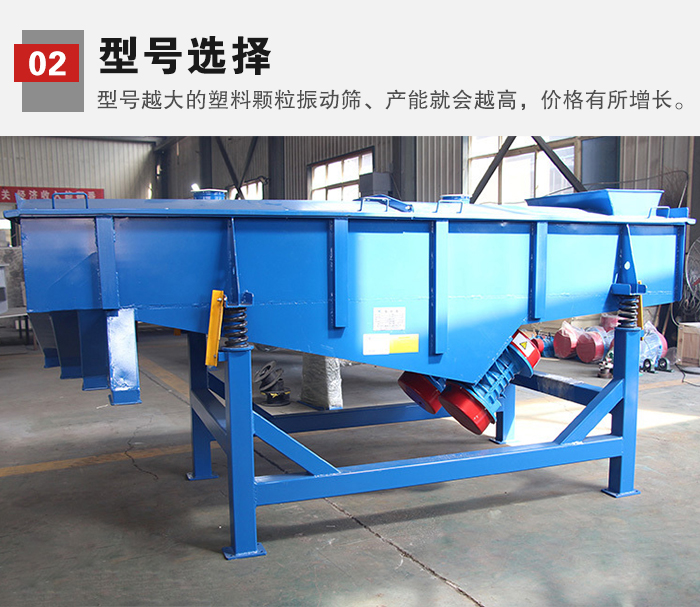 2、型號(hào)選擇:各種塑料顆粒振動(dòng)篩型號(hào)多樣,型號(hào)越大的塑料顆粒振動(dòng)篩、產(chǎn)能就會(huì)越高,相應(yīng)的價(jià)格也會(huì)有所增長(zhǎng)。