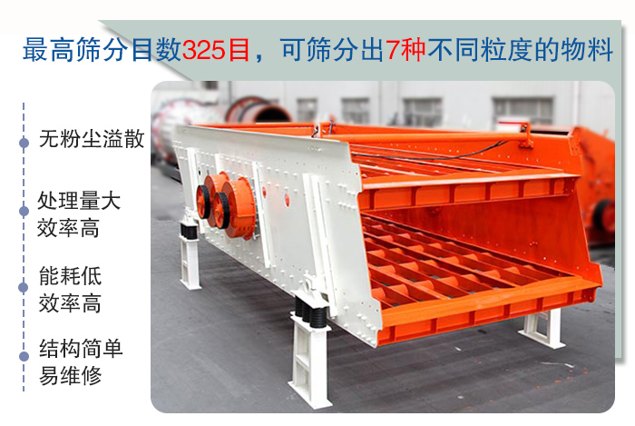 具有能耗低、效率高、結構簡單、易維修、全封閉結構、無粉塵溢散等特點。最高篩分目數325目,可篩分出7種不同粒度的物料。